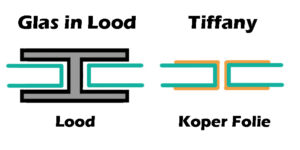 Tiffany is een compleet andere techniek dan glas in lood. Bij glas in lood heb je twee stukken glas, die je dan in het lood zet, als een soort van puzzel. Bij glas in lood heb je ook het loodhart, dat is het lood dat in het midden zit tussen de twee glasstukken.